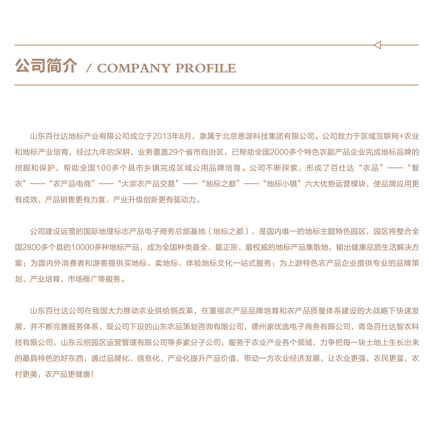 2020年3月6月,山东云招园区运营管理有限公司正式成立; 2020年4月,德州市农产品区域公用品牌建设启动会暨培训会顺利召开,标志着地市级农产品区域公用品牌业务上线; 2020年6月,慧供品牌平台正式上线; 2020年6月12日,山东农品策划咨询有限公司在德州正式成立; 2020年10月,百仕达地标之都产业园正式开放。