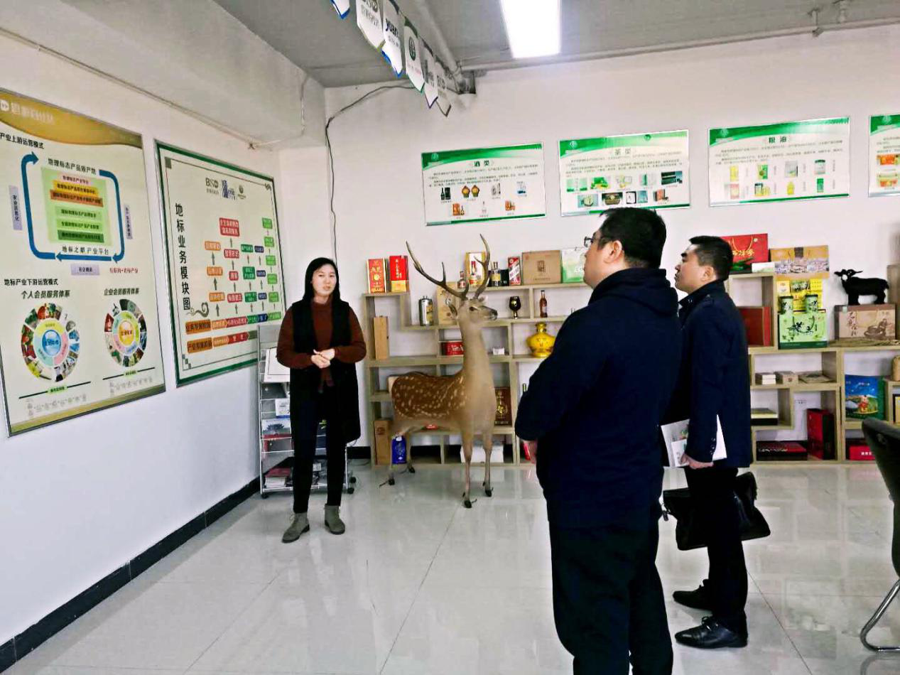 在全国地理标志产品产业展厅,边新燕向刘区长、魏主任介绍了地理标志产品行业的起源及发展历程,详细介绍了公司业务发展阶段及产业发展阶段所做的工作以及未来的发展规划,并参观了解了产自全国各地的地理标志产品。