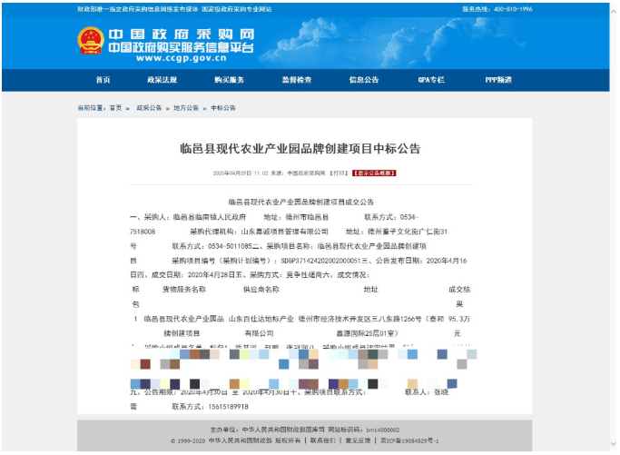 2020年4月29日,山东百仕达顺利中标临邑县现代农业产业园品牌创建项目。