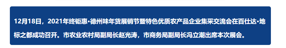 本次德州味年货节集中宣传了我市区域农业特色,展会汇聚的三百余种政府背书优质特色农产品和应邀前来的50余家跨行业专业采购商和企事业单位集采人员,有效调动了各方参展的积极性,从乡村振兴、精准扶贫、品牌建设、农业创新等多个方面,集思广益,为我市农业发展建言献策,经贸合作成效超出预期,展会经济功能、文化效应、社会效益得到最大化发挥。