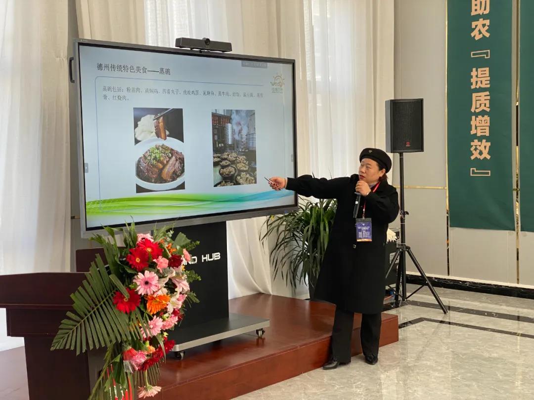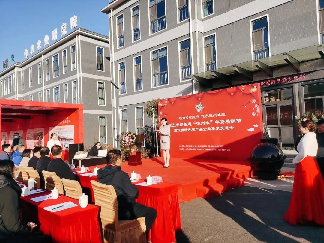 本次德州味年货节除了常规32家产品展会区外,还另设置了特色产品产销对接会,由山东德州倚诚扒鸡有限公司、山东照硕现代农业科技有限公司、夏津素源生物科技有限公司、新疆喀什疏附县木亚格杏区域公用品牌进行现场推介交流,近十家集采单位参与旁听。