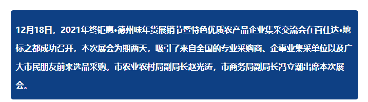 本次德州味年货节集中宣传了我市区域农业特色,展会汇聚的三百余种政府背书优质特色农产品和应邀前来的50余家跨行业专业采购商和企事业单位集采人员,有效调动了各方参展的积极性,从乡村振兴、精准扶贫、品牌建设、农业创新等多个方面,集思广益,为我市农业发展建言献策,经贸合作成效超出预期,展会经济功能、文化效应、社会效益得到最大化发挥。