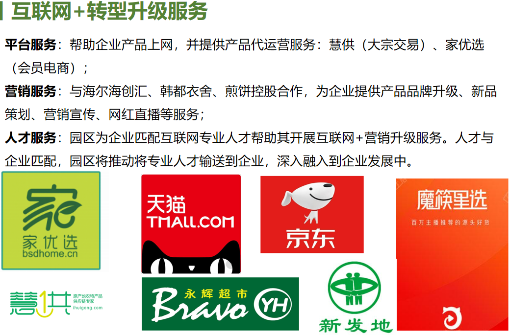 地标之都为入驻企业提供地标产品交易公共服务平台,依托慧供、家优选等电商平台,提供产品上网及代运营服务,园区与海尔海创汇、韩都衣舍、魔筷星选等深入洽谈合作,将产品品牌孵化、创业团队孵化、网红直播等服务引入,赋能品牌展销运营升级。
