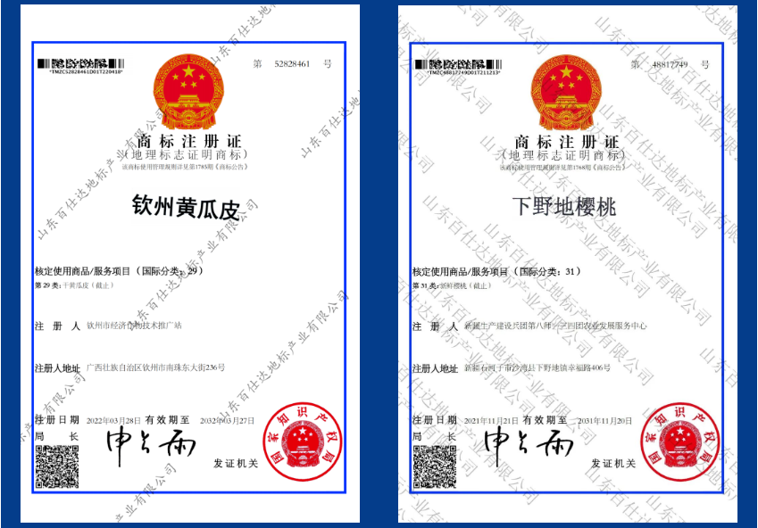 黄河涯蜜桃、辉县草鸡蛋、李官葡萄、平山粉条、饮州黄瓜皮、下野地樱桃下发地理标志证明商标证书。(通讯员:李倩倩)