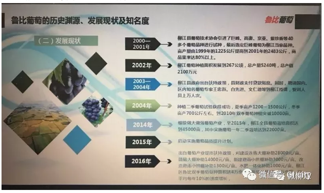 2016—2017年,柳江区出台葡萄产业提质扶持政策,对建设连栋大棚补助28000元/亩、简易大棚补助14000元/亩、新建避雨小拱棚补助3000元/亩、改造避雨小拱棚补助1300元/亩、水肥一体化补助1000元/亩)。同时,强化与广西农科院等科研院校、机构的合作,提升葡萄科学种植水平。通过政策扶持,依靠科技引领,使柳江区葡萄产业迅速走上规模化、产业化、标准化、品牌化的发展道路。