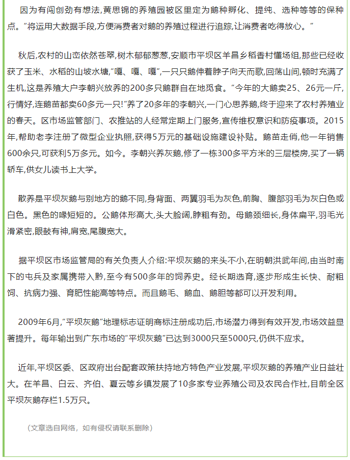 平坝灰鹅:品牌富农 产业孵出“金蛋蛋”