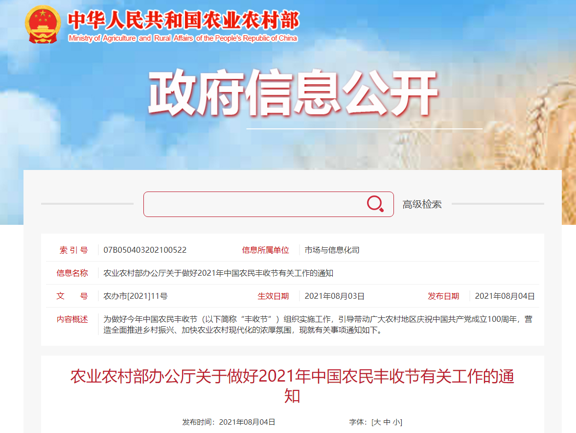 为做好今年中国农民丰收节(以下简称“丰收节”)组织实施工作,引导带动广大农村地区庆祝中国共产党成立100周年,营造全面推进乡村振兴、加快农业农村现代化的浓厚氛围,现就有关事项通知如下。