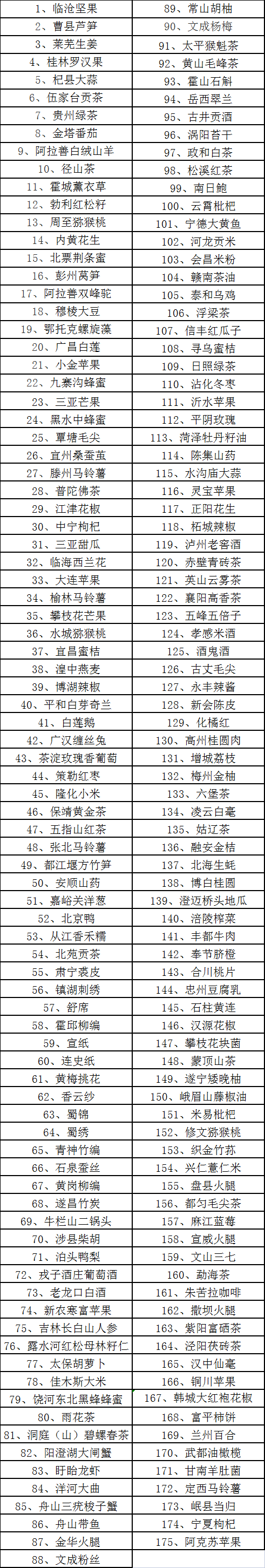 根据《中欧地理标志协定》要求,中国第一批100个知名地理标志已生效获得欧盟的保护。第二批175个地理标志产品,将会在今后的4年内完成相关保护程序。275个中国地理标志产品如下: