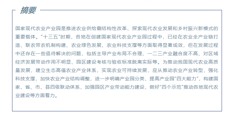 借鉴国内一些学者对现代农业产业园的研究成果,本文的研究创新主要体现在以下方面:第一,基于推进农业供给侧结构性改革和培育农业农村发展新动能的背景和视角,对当前的国家现代农业产业园发展状况进行分析,试图从整体视角找寻现代农业产业园所存在的共性问题;第二,将建设国家现代农业产业园与农业供给侧结构性改革、培育农业农村新动能进行有效衔接和统一,进而提出“十四五”时期国家现代农业产业园发展的新思路,实现国家现代农业产业园发展思路的转变。第三,尝试性地将国家现代农业产业园的发展提高到全面建设社会主义现代化强国、实现我国农业农村现代化的高度来认识,进而提出“十四五”时期推动国家现代农业产业园高质量发展的政策建议,为加快我国农业农村现代化和实现乡村振兴夯实基础。